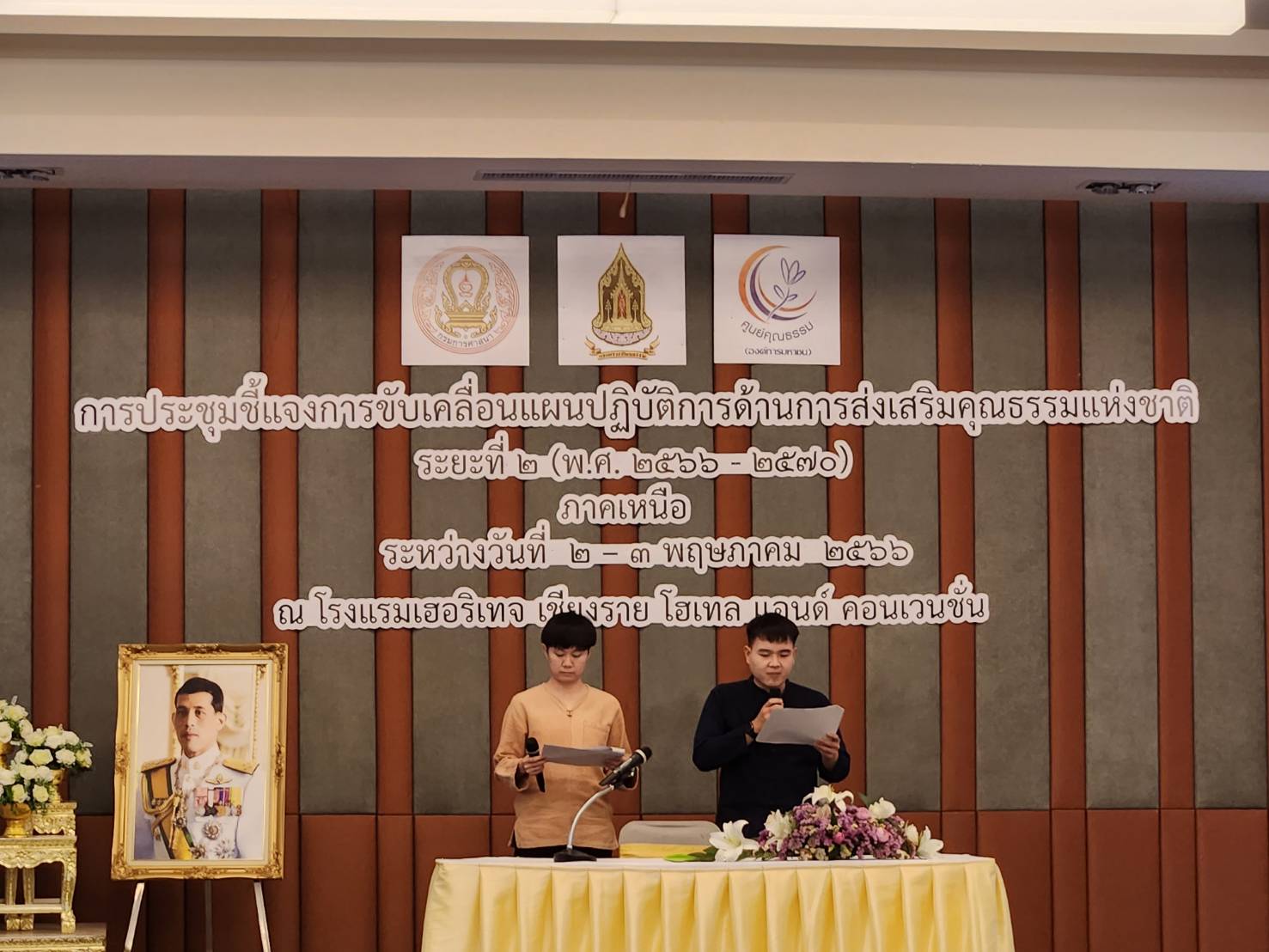 2-3 พฤษภาคม 2566 ศูนย์คุณธรรม (องค์การมหาชน) นำโดย นายยงจิรายุ อุปเสน ผู้จัดการสำนักส่งเสริมและขับเคลื่อนเครือข่ายทางสังคม และทีมวิชาการจากกลุ่มงานนโยบายและยุทธศาสตร์ และกลุ่มงานวิจัยนวัตกรรมและระบบพฤติกรรมไทยร่วมจัดประชุมกลุ่มย่อย “แนวทางในการนำแผนปฏิบัติการด้านการส่งเสริมคุณธรรมแห่งชาติ ระยะที่ 2 (พ.ศ. 2566 - 2570) ไปสู่การปฏิบัติ และแนวทางการยกระดับและขยายผลเครือข่ายชุมชน องค์กร อำเภอ ในพื้นที่ 17 จังหวัดภาคเหนือ ณ โรงแรมเฮอริเทจ เชียงราย โฮเทล แอนด์ คอนเวนชั่น อ.เมือง จ.เชียงราย