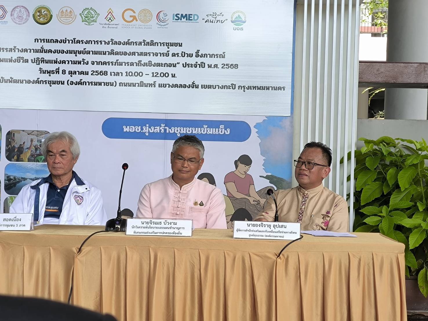 8 ตุลาคม 2568 รศ.นพ.สุริยเดว ทรีปาตี ผู้อำนวยการศูนย์คุณธรรม มอบหมายให้นายยงจิรายุ อุปเสน ผู้จัดการสำนักส่งเสริมและขับเคลื่อนเครือข่ายทางสังคม ร่วมเวทีแถลงข่าวรางวัล‘รางวัล ดร.ป๋วยฯ’ “จากครรภ์มารดาถึงเชิงตะกอน” ร่วมกับเครือข่ายสวัสดิการชุมชน 5 ภาค วิทยาลัยพัฒนศาสตร์ ป๋วยฯ และภาคีรัฐ-เอกชน รวม 10 หน่วยงาน เปิดตัวโครงการ “รางวัลองค์กรสวัสดิการชุมชน ผู้สรรสร้างความมั่นคงของมนุษย์” ประจำปี พ.ศ. 2568 ซึ่งจัดขึ้นเป็นครั้งที่ 9 ในรอบ 10 ปี เพื่อสืบสานแนวคิด “คุณภาพแห่งชีวิต ปฏิทินแห่งความหวัง จากครรภ์มารดาถึงเชิงตะกอน” ของ ศาสตราจารย์ ดร. ป๋วย อึ๊งภากรณ์ มีผู้เข้าร่วมกว่า 40 คน ณ ลานดอกปีบ ชั้น 1 สถาบันพัฒนาองค์กรชุมชน (พอช.)