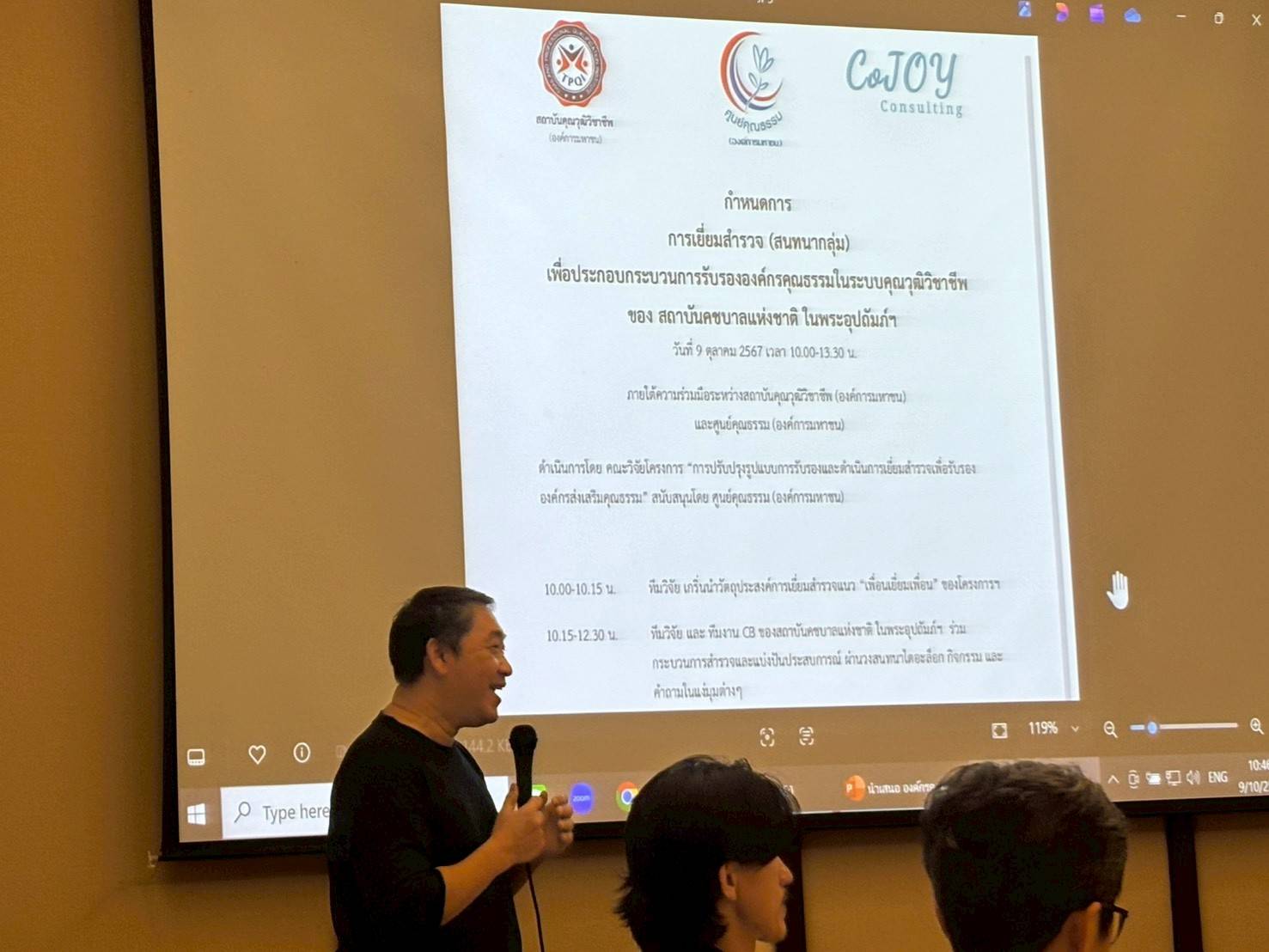 9 ตุลาคม 2568 ศูนย์คุณธรรม (องค์การมหาชน) โดยกลุ่มงานวิจัยนวัตกรรมและระบบพฤติกรรมไทย ร่วมกับสถาบันคุณวุฒิวิชาชีพ (องค์การมหาชน) ดำเนินการเยี่ยมสำรวจ (Sensing the field) สถาบันคชบาลแห่งชาติ ในพระอุปถัมภ์ฯ อ.ห้างฉัตร จ.ลำปาง
