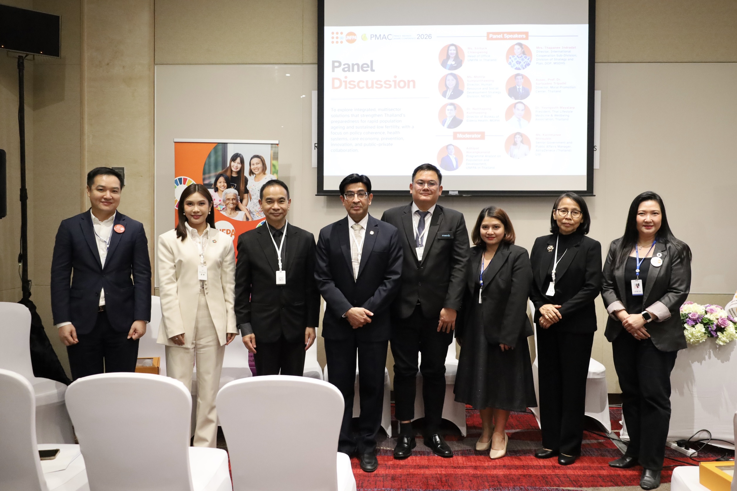 26 มกราคม 2569 รศ. นพ.สุริยเดว ทรีปาตี ผู้อำนวยการศูนย์คุณธรรม ได้รับเชิญจาก กองทุนประชากรแห่งสหประชาชาติ ประจำประเทศไทย (UNFPA Thailand) เข้าร่วมเสวนาในหัวข้อ “นวัตกรรมพหุภาคีเพื่อเสริมสร้างความเข้มแข็งด้านโครงสร้างประชากรของประเทศไทย ท่ามกลางความท้าทายของสังคมสูงวัยและอัตราการเกิดต่ำ” ซึ่งจัดขึ้นในรูปแบบการประชุมเสวนาคู่ขนานระดับนานาชาติ ภายใต้การประชุมรางวัลสมเด็จเจ้าฟ้ามหิดล (Prince Mahidol Award Conference: PMAC 2026) ณ ห้อง Lotus Suite 14 โรงแรมเซ็นทาราแกรนด์ บางกอก คอนเวนชัน เซ็นเตอร์ แอท เซ็นทรัลเวิลด์ กรุงเทพมหานคร